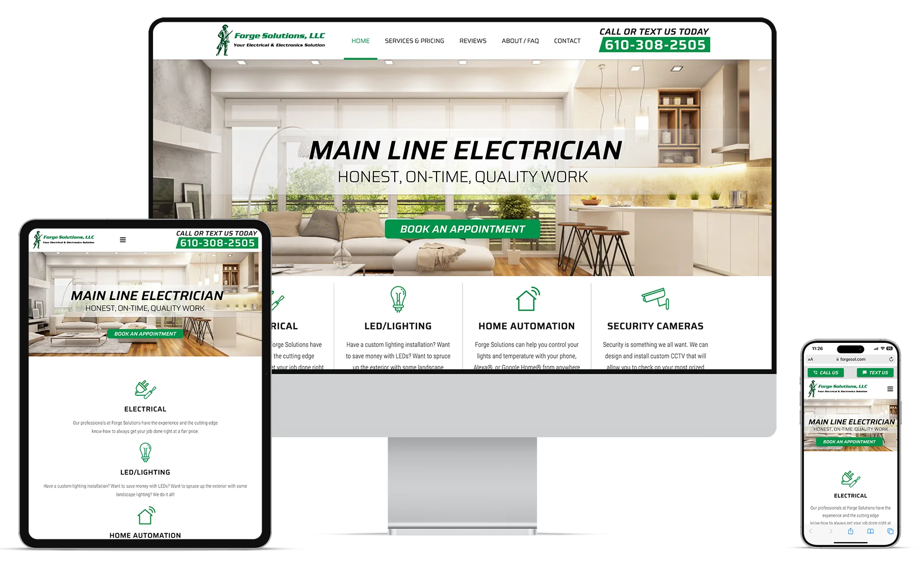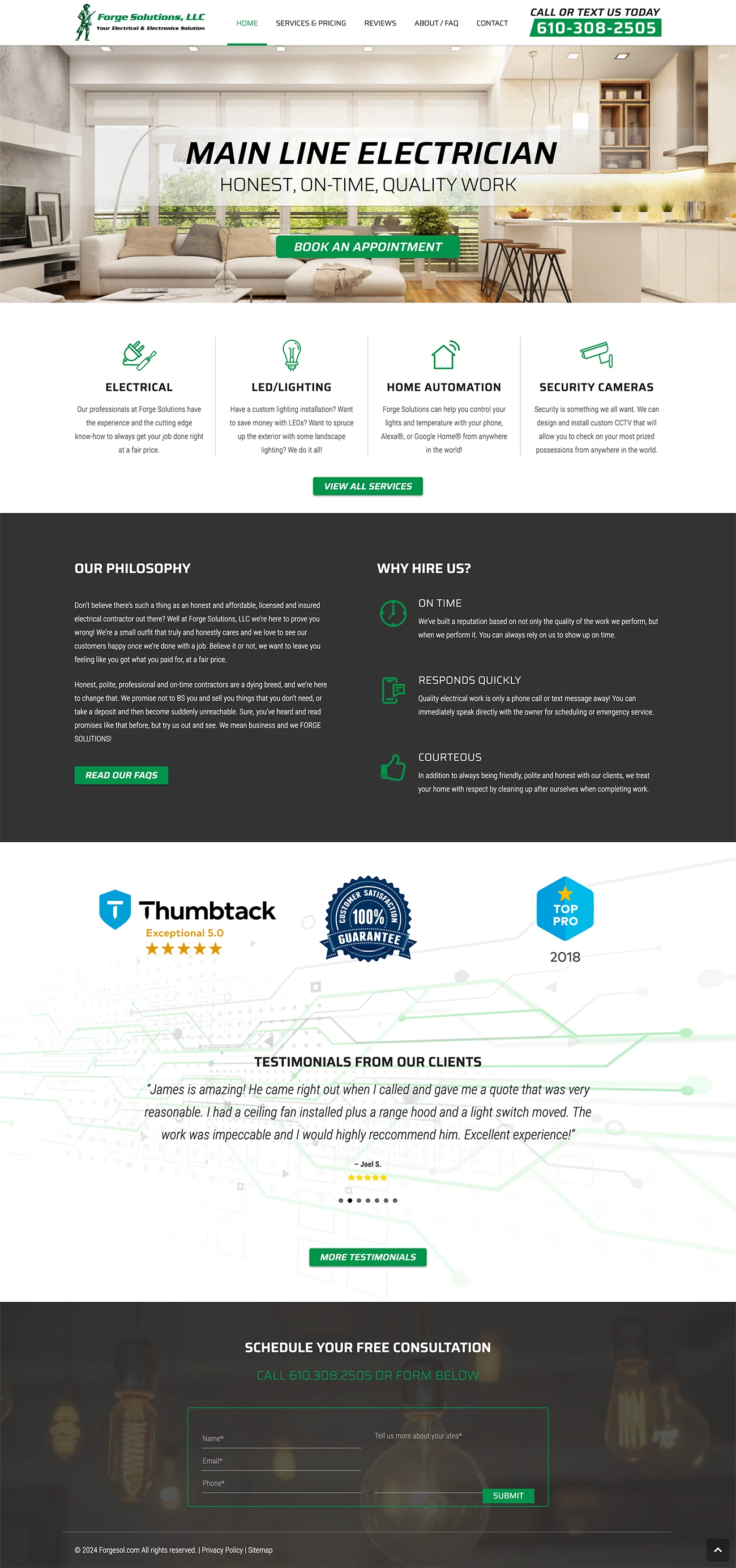 Forge Solutions is a licensed and certified electrician serving Philadelphia and across the Main Line. Forge Solutions values honesty and being on-time for any electrical job whether it involves outlet installations, LED lighting, or home automation. The responsive website provides a clean, simplified layout to express these values and focus on clear Calls-To-Action for mobile quick-response call or text communication.