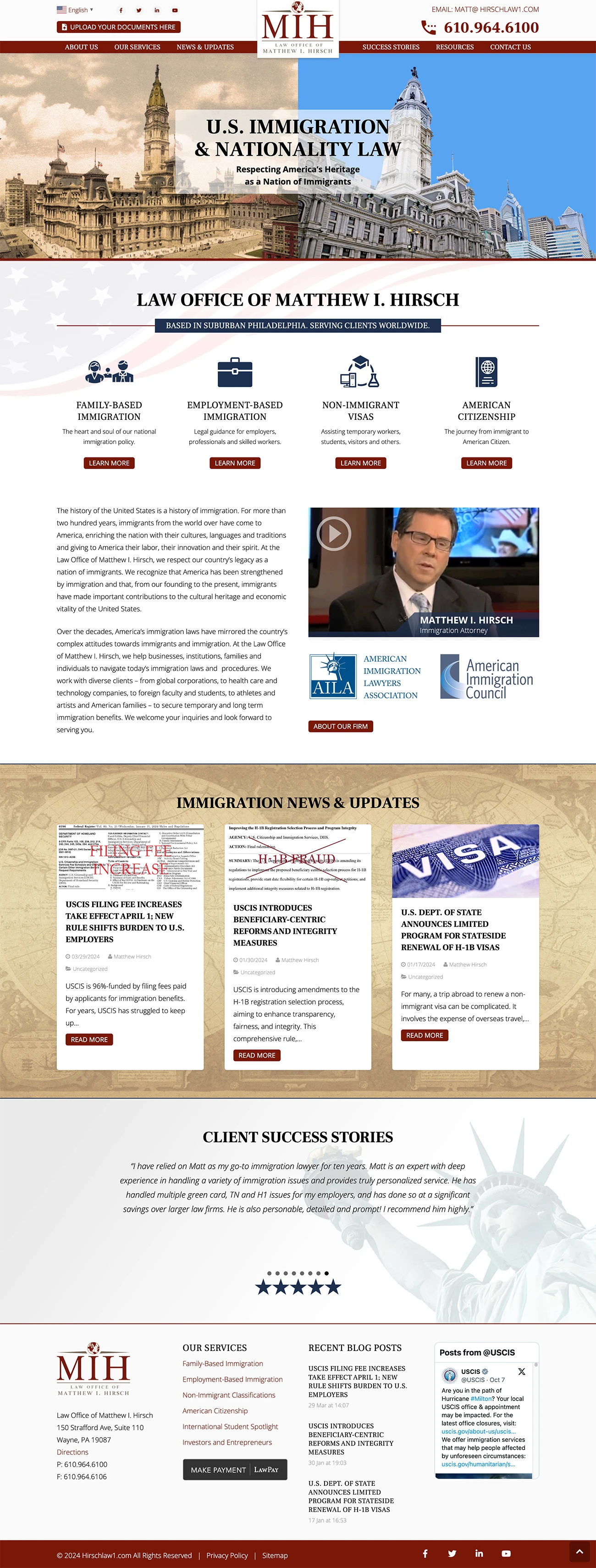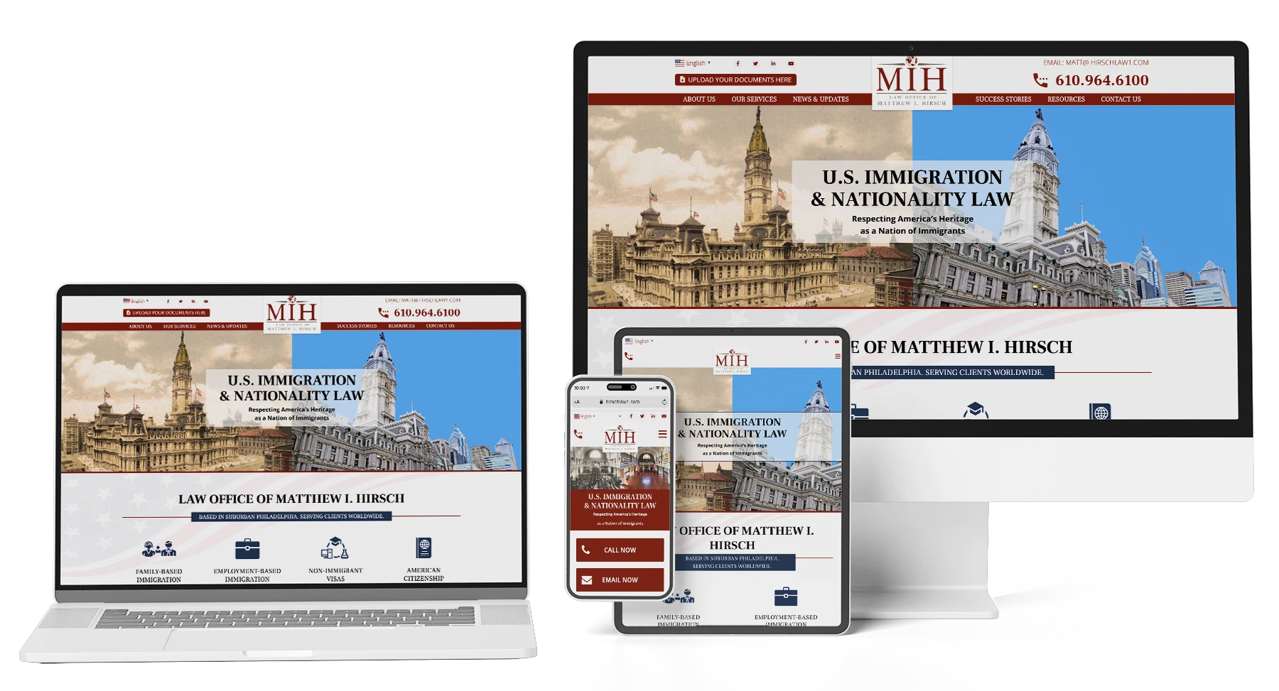 The Law Office of Matthew I. Hirsch focuses on continuing the tradition of United States Immigration. At the time, he was equipped with a nice logo and print materials, however the branding was not applied to a functional website.