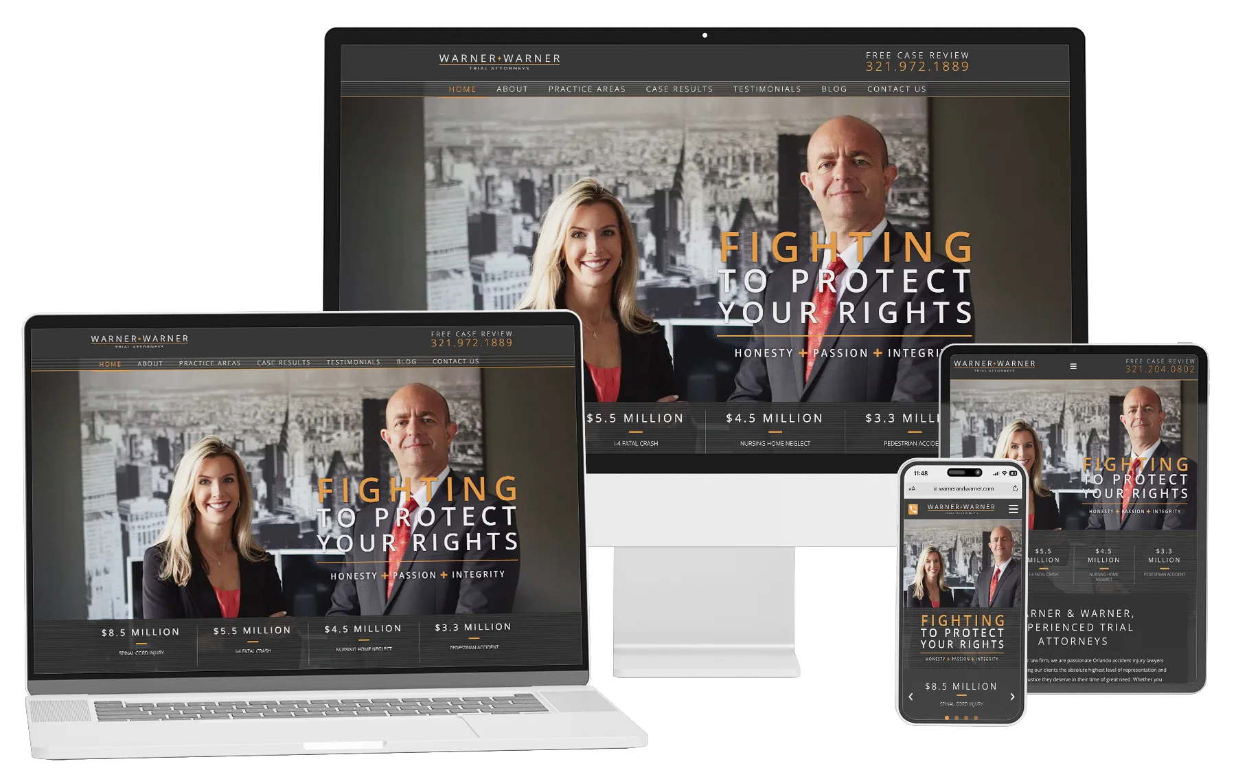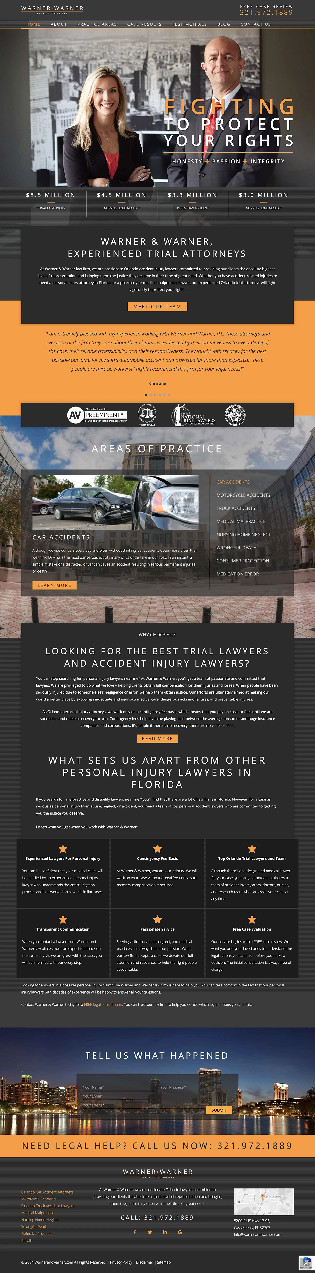 Warner & Warner is a compassionate law firm based in Orlando, Florida. They vigorously represent clients who range from being victims of personal injury and medical malpractice to nursing home abuse and neglect. The website created for this husband and wife team of attorneys accentuates their brand colors in a serious, yet sophisticated tone to clearly highlight the services they offer and how to get in touch with them.