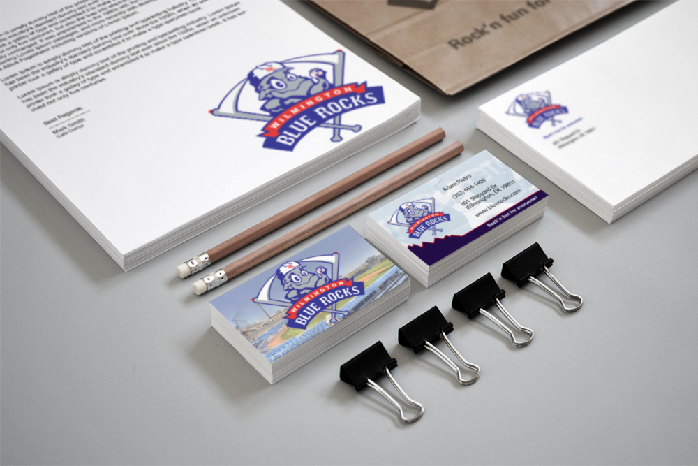 This potential branding concept uses a visual metaphor, which connects with Wilmington’s history as a mining community. The baseball & mining themes meet when baseball bats combine with pick-axes to form a baseball diamond and function as a frame for the “Rock Mascot” who wears the mining hard hat. The brand was applied to letterhead, business cards, and ads targeting different audiences.